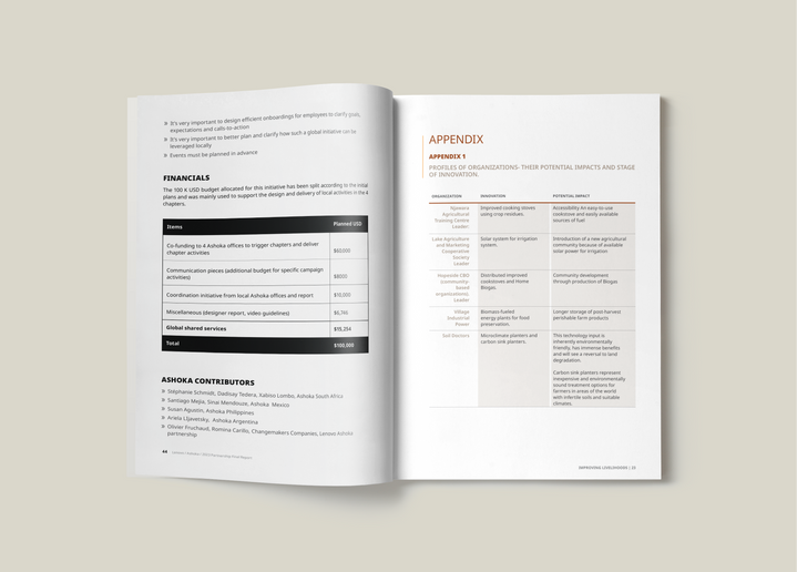 To address the challenge, we designed a visually engaging and accessible report featuring structured layouts, charts, graphs, and infographics. These elements effectively convey research findings, emphasizing the impact of changemakers and fostering collaboration and innovation in social enterprise. The deliverables include a comprehensive design, ensuring clarity and consistency throughout.